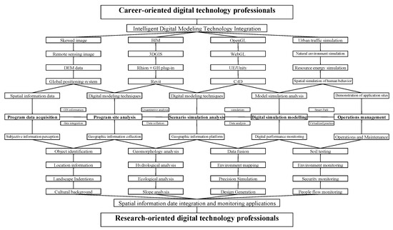 Taking the training stage of “dual-capable talents with digital twin technology” for graduate students of architecture as the goal, we sort out the academic track and curriculum system, and utilize the digital twin project-type teaching for learning and training in smart city parks, and sort out the fundamental logic of the construction and the technical design path, as shown in Figure 10.