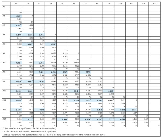 The researcher conducted an independent samples t-test on the measurement data using SPSS Statistics 27 software to verify the feasibility of the questionnaire through correlation and validity analysis, as shown in Figure 13 and Table 3, with A1–A13 denoting the questionnaire question types.