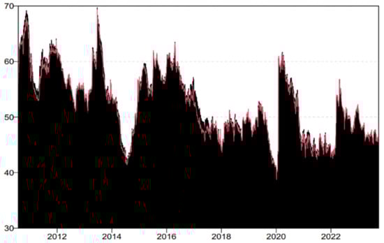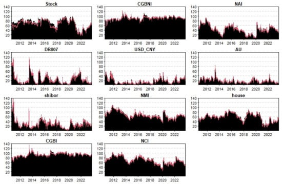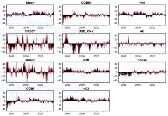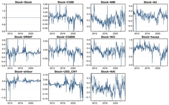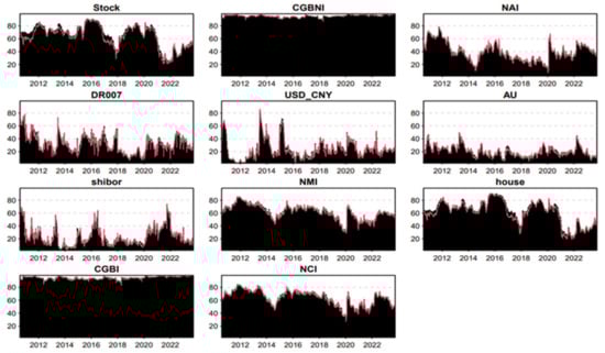During the sample period, the risk spillover index for China’s financial markets fluctuated between 40% and 70%, exhibiting uncertainty and volatility. Overall, the total risk spillover index showed a downward trend, with significant increases during periods of supply–demand imbalance in 2013, stock market turbulence in 2015, and the outbreak of the COVID-19 pandemic in 2020, demonstrating the model’s effectiveness in capturing systemic risk changes. In 2015, following a rapid bull market and subsequent significant corrections in the Chinese stock market, financial deleveraging was reintroduced in 2016 to reduce financial system risk, ensure robust economic growth, and promote economic structural optimization. This led to a significant drop in the spillover risk index. Small increases occurred in 2017 and 2018 amid debt defaults and the crisis in internet finance. Thus, the risk spillover index calculated in this study accurately reflects the systemic risk level of China’s financial markets and provides regulatory authorities with an effective tool for dynamic risk monitoring.