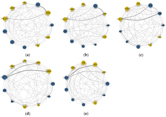 Analysis of the financial market volatility spillover network. Note: The subfigures in Figure 5 illustrate the following: (a) Full sample period, with a total risk spillover of 52.2%; (b) Post-financial crisis adjustment period, with a total risk spillover of 58.23%; (c) 2015 stock market turmoil period, with a total risk spillover of 68.6%; (d) U.S.-China trade friction period, with a total risk spillover of 48.98%; and (e) COVID-19 pandemic period, with a total risk spillover of 58.95%.