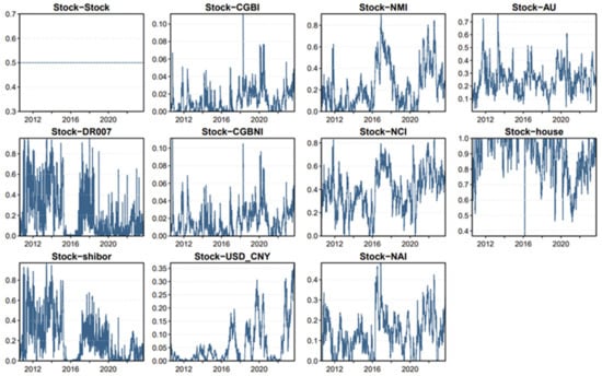 The USD_CNY exhibits a large standard deviation of 7.47, indicating high volatility in the hedge ratios with ESG stocks, which reflects substantial market risk. Conversely, the average hedge ratios of ESG stocks against Shibor, NMI, NCI, NAI, and House are positive, indicating a direct relationship between stock prices and these indices. These indices have smaller standard deviations, such as the real estate market’s 0.17, suggesting lower volatility and risk in the associated hedge ratios. Additionally, Table 4 indicates that these optimal hedge ratios are not static but vary over time, as shown by the standard deviations and the 5th and 95th percentiles. Figure 5 corroborates the time-varying nature of the optimal hedge ratios, indicating that investors should adopt dynamic rather than static hedging strategies. On the other hand, when ESG stocks (Stock) are used as hedging assets, their volatility is relatively lower. For instance, the hedge ratios between Stock/DR007 and Stock/CGBI show significant volatility, whereas DR007/Stock and CGBI/Stock exhibit the opposite trend. Thus, investors using ESG stocks for hedging can benefit from lower hedging costs and relatively stable hedge ratios.