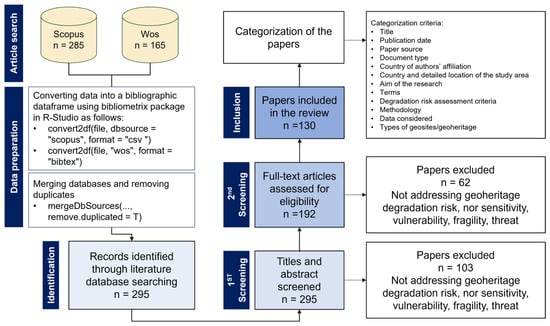 In order to collect and analyze studies dealing with the degradation risk of geoheritage, a literature search was performed in Scopus and Web of Science (WoS) by applying the following research query to “title”, “abstract” and “keywords”: (sensitivity OR vulnerability OR fragility OR threat*) OR degradation AND risk) AND (geosite* OR geoheritage OR geomorphosite*). All types of documents were considered (e.g., articles, conference papers, book chapters, reviews). The literature search did not have a specific end-date constraint, and all relevant articles indexed in the database as of 19 June 2024, when the research was conducted, were included.