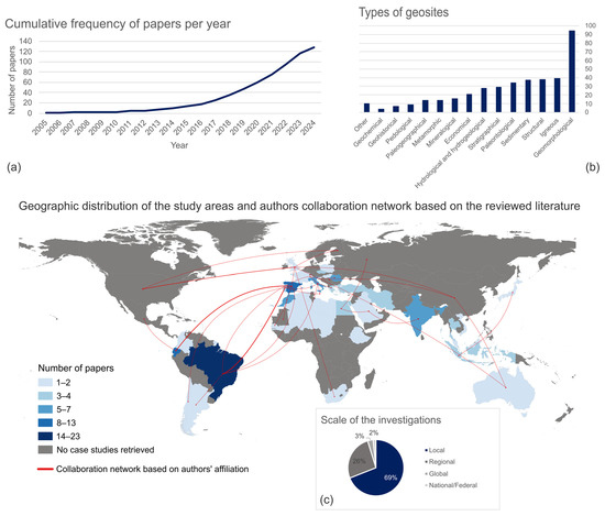 Spatial distribution of the study areas and collaboration network among authors in the selected literature. The plots in the frames illustrate (a) the cumulative curve of the number of papers published per year, (b) the number of papers for each type of geoheritage considered, and (c) the spatial scale of the studies in the reviewed literature.
