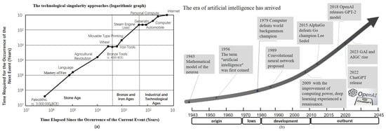 (a) Technological singularity in history [7,8,9]; (b) history of artificial intelligence [10,11,12].