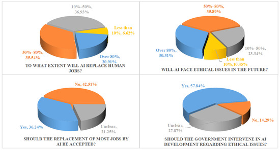 A survey was conducted by randomly selecting 300 undergraduate students from Taiyuan University of Technology using a questionnaire method. The survey questionnaire and results are provided in Supplementary Materials Table S1. Among these students, 70% are enrolled in programs related to AI development. The purpose of the survey is to analyze the social impact of AI and public opinion, as well as to assess human trust and confidence in AI. Out of the 300 questionnaires distributed, 287 were returned, and all returned questionnaires were valid responses. Figure 3 illustrates the survey results for certain questions in the questionnaire.