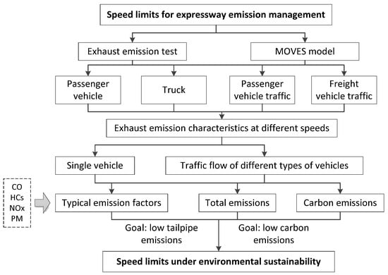 The analysis of traffic flow emissions employs single-vehicle experimental data to optimize the MOVES (MOtor Vehicle Emission Simulator) model and calibrate key parameters for expressway projects, enabling the prediction of traffic flow exhaust emissions. By combining the results from single-vehicle exhaust emissions with traffic flow predictions, we can examine the variation characteristics of typical emissions, total exhaust emissions, and carbon emissions with speed for different vehicle types, which include M1-light passenger vehicles, N1-minivans, N2-light heavy-duty vehicles, N3-medium heavy-duty vehicles, and N4-large heavy-duty vehicles. Ultimately, the findings yield conclusions regarding the exhaust emission characteristics of vehicles on expressways and establish speed limit thresholds for various vehicle types from the perspectives of optimizing exhaust emission control and fostering sustainable travel environments on expressways. The conceptual framework is shown in Figure 1.