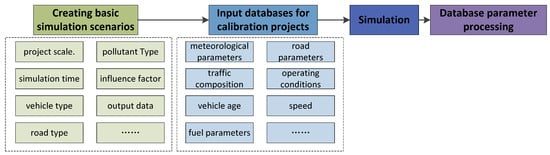 MOVES can be applied at various levels (i.e., macro-, meso-, and micro-levels), and this study focuses on the micro-level, examining traffic emissions on a detailed scale. The micro-level module (project model) was selected for parameter calibration and analysis. Taking actual engineering projects as a reference, we can analyze the exhaust emissions from M1-light passenger and N-freight vehicles traveling at different speeds, assuming identical traffic volumes, compositions, and vehicle characteristics. The simulation process for traffic flow exhaust emissions based on MOVES is illustrated in Figure 2.