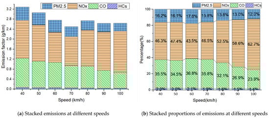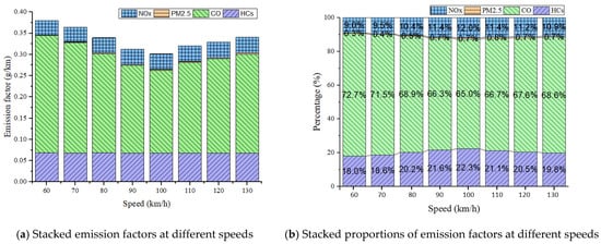The trends in emission accumulation for various factors at different speeds (see Figure 3a) indicate that among the typical pollutants, NOx emissions are the lowest, while CO emissions are the highest, followed by HCs, with PM2.5 emissions being slightly lower than HCs.