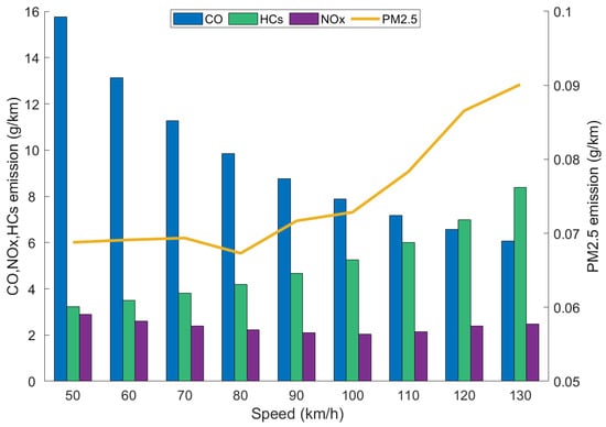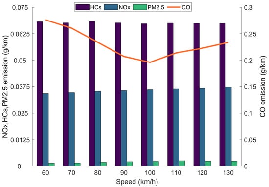 Considering the toxicity of emissions, public concern, and the comprehensiveness of the indicators, CO, NOx, particulate matter (PM2.5), and HCs were selected as representative emission components. By analyzing the variations in these indicators at different speeds, we can pinpoint the speed ranges that minimize exhaust emissions. This will provide valuable insights and recommendations for the operational management of expressways.