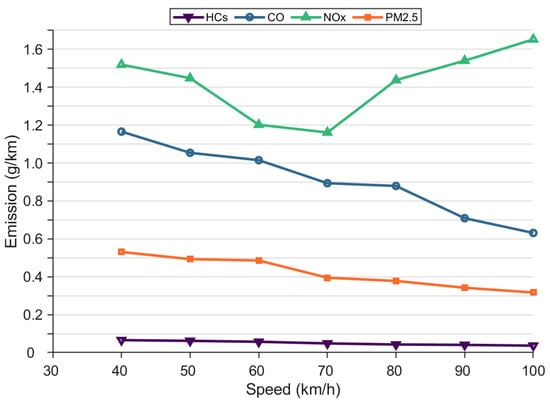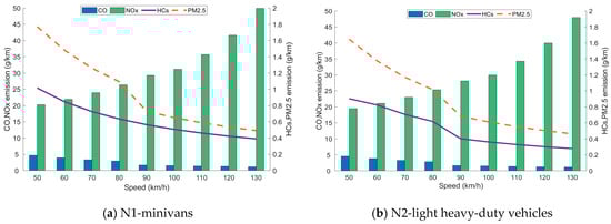 - The trends in CO, PM2.5, and HCs emissions across the four vehicle types are consistent: they all decrease with the increase in speed, initially dropping rapidly before tapering off. At low speeds, freight vehicle engines operate under low loads, leading to reduced combustion efficiency. As speed increases, the engine transitions to a more stable operating condition, resulting in improved combustion efficiency [60]. Increasing speed up to 80 km/h, the decrease in CO, PM2.5, and HCs emissions is more pronounced; above 90 km/h, the reduction becomes slower. The steepest declines for these three emission factors occur within the 80–90 km/h range.