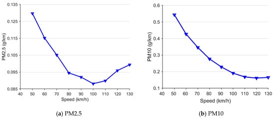Both PM2.5 and PM10 demonstrated a general “U-shaped” trend with increasing speed. At medium to high speeds (greater than 80 km/h), PM2.5 and PM10 emissions were relatively low, particularly for PM10, which exhibited significantly reduced emissions.