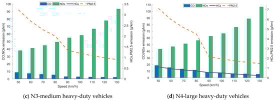 In the MOVES model, emissions from N-freight vehicles are categorized into four classes: N1-minivans and N2-light (total weight between 6.3 and 8.77 t), N3-medium (total weight between 8.77 and 14.85 t), and N4-large (total weight over 14.85 t) heavy-duty vehicles. The exhaust emissions were simulated for heavy trucks at speeds ranging from 50 to 130 km/h with intervals of 10 km/h. The simulation results for CO, NOx, HCs, and PM2.5 emissions for the four vehicle types are illustrated in Figure 9 and are detailed as follows:
