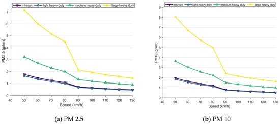 Additionally, it is important to consider that PM generated during vehicle operation originates not only from exhaust emissions but also from brake friction, tire wear, road surface wear, and dust [58,59]. To further explore the relationship between PM and vehicle speed, the MOVES non-exhaust emissions module was activated to predict PM2.5 and PM10 emissions. These were combined with the PM from vehicle exhaust emissions to plot the PM generation at varying speeds for M1-light passenger vehicle traffic flow, as shown in Figure 8.