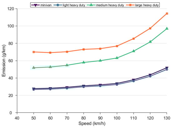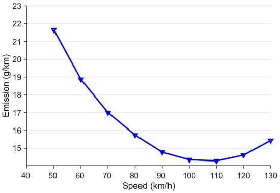 The relationship between vehicle speed and exhaust emissions is complex and multifaceted [18], varying significantly across different vehicle models, engine types, and driving conditions. While it is generally understood that extreme speeds—both high and low—can lead to increased emissions [19,20], the specific thresholds at which different vehicle types optimize their emission output remain largely undefined, especially in the context of highway travel. Studies have shown that at extremely high speeds, both fuel consumption and the emission of pollutants [21], such as CO2, can increase sharply because of various factors, such as increased aerodynamic drag and engine inefficiency [22]. Similarly, driving at very low speeds can result in suboptimal engine performance and elevated emissions, as vehicles struggle to maintain momentum [23,24]. This U-shaped relationship between speed and emissions highlights the need for a more nuanced understanding of the speed ranges that minimize pollutant output for different vehicle categories. Furthermore, an in-depth analysis of vehicle-specific speed limits and their impact on overall emission performance is essential.
