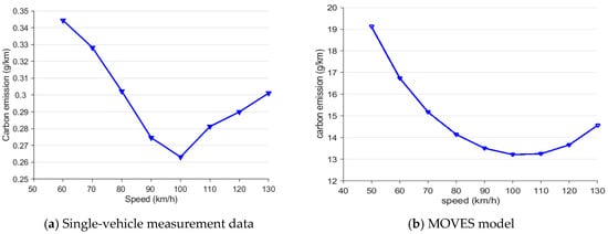 Based on the data reported in Section 3 regarding the characteristics of total exhaust emissions and carbon emissions, the selection of speed ranges should prioritize low exhaust and, specifically, low carbon emissions. According to the analyses in Section 3.3 and Section 3.4, along with the fitting of the formulas, the carbon and exhaust emissions from M1-light passenger vehicles, whether taken individually or in traffic flow, satisfy a quadratic function relative to speed. The speeds at which exhaust emissions are minimized were calculated, as shown in Table 5. Moreover, based on the emission curves, the speed range for low exhaust emissions from M1-light passenger vehicles was found to be 90–120 km/h, while for low carbon emissions, the range is 90–110 km/h.