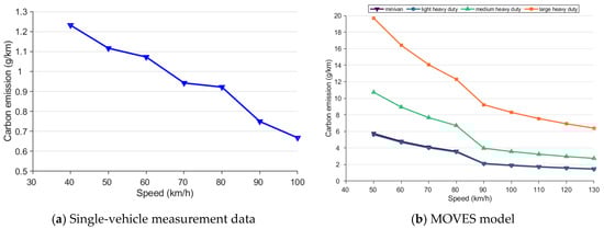 The differences in the data may stem from the fact that the real-vehicle experiments focused on a single model and individual-vehicle emissions. An individual vehicle may exhibit variability in emissions, whereas the MOVES model analyzes emissions in the context of highway environments, avoiding the bias associated with single-vehicle emissions, resulting in more macro-level insights. In the analysis, it is thus essential to consider the common patterns evident in both sets of data.