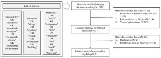 For the related study, a systematic review of the literature was conducted using the Preferred Reporting Items for Systematic Reviews and Meta-Analyses (PRISMA) methodology [26,27]. The study data were obtained from the global academic database called the Web of Science (WOS) [28,29,30]. The WOS database was searched using the following strings: (“sustainability” OR “sustainable” OR “sustainable strategies” OR “sustainable design” OR “sustainable development”) AND (“settlement” OR “village” OR “dwelling” OR “house” OR “architecture” OR “building”) AND (“traditional “OR “native” OR “indigenous” OR “folk” OR “vernacular” OR “local” OR “rural” OR “historical”). We obtained a total of 2011 articles related to the sustainability of traditional villages. To ensure comprehensive coverage, articles and publication information with relevant research in their titles and abstracts were reviewed. The review process adhered to pre-defined selection and exclusion criteria. The identified general inclusion criteria consist of relevance, authority, and generalizability [31,32]. Relevance defines the material’s contribution to the traditional village’s sustainable development, authority relates to the source of the publication, and generalizability reflects the effects of the material out of the 131 articles identified according to these standards [31]. After a full-text search, 71 articles were ultimately selected, as depicted in Figure 1.