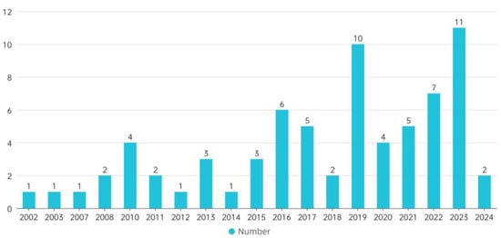 Based on the data in Figure 2, research on the sustainability of traditional villages between 2000 and 2004 was rare. This suggests that there was limited attention to this topic at the beginning of the 21st century. However, the number of studies increased significantly after 2005, with a notable surge in the following 2015. This increase indicates a growing global interest in the sustainability of traditional villages. The rise in research activity is also influenced by global emphasis on cultural heritage preservation and the Sustainable Development Goals (SDGs).