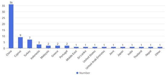 Figure 3 illustrates that the literature on the sustainability of traditional villages primarily originates from several countries and regions, including China, Cyprus, Turkey, Malaysia, Indonesia, Greece, and Portugal. Among these, China has the highest number of studies, reflecting its strong emphasis on the conservation and sustainability of traditional villages, which is also related to its large number of such villages. Cyprus and Turkey also contribute a significant number of studies driven by their focus on the sustainability of traditional villages, which is linked to their cultural heritage value and sustainable tourism initiatives.