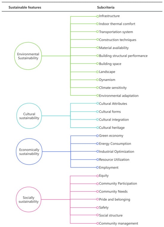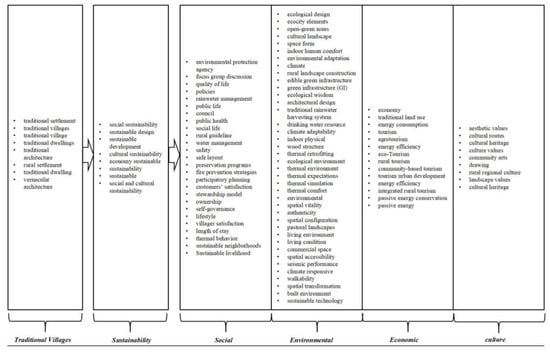 Figure 4 shows the keywords in sustainability research of traditional villages, which are classified and arranged according to the theory of four pillars of sustainability. The figure mainly includes the following: