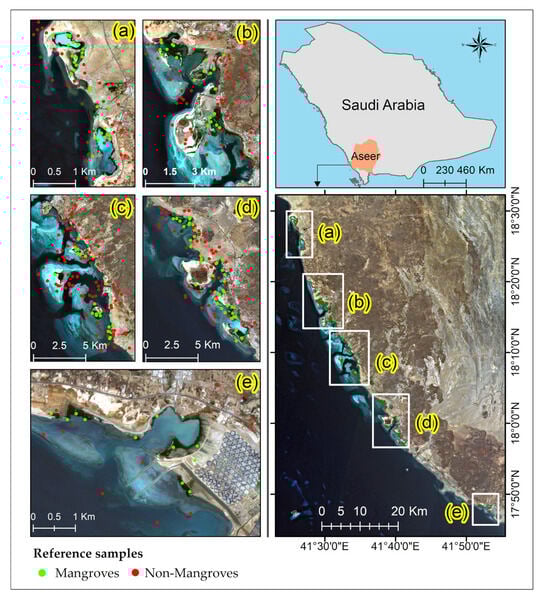 Geographical extent of the Asir mangrove ecosystems, showing the distribution of the reference samples (green for mangroves, red for non-mangroves) across the study area. The study area is divided into five areas (a–e), spanning from north to south. The mangrove distribution follows the pattern of thriving in protected areas such as lagoons, tidal flats, and wadis. The division aids in understanding the spatial variations in mangrove coverage, as detailed in Table 1.