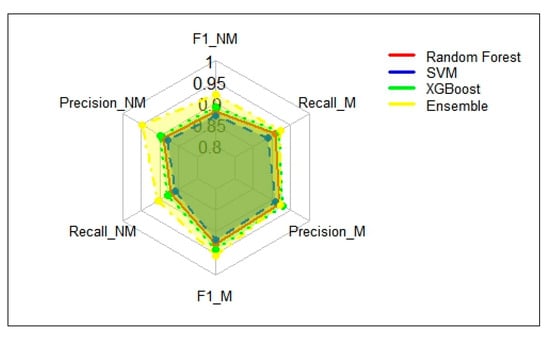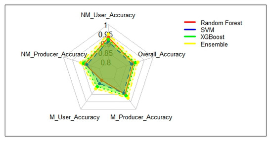 The radar plot (Figure 4) reveals that the XGB classifier performed well in mangrove classification, achieving an F1 score of 94%, and the RF showed relatively strong precision for non-mangrove classification at 89%. The SVM, although slightly lower in both precision and recall, maintained a balanced performance across all the metrics. The ensemble model capitalizes on these individual strengths, resulting in an improved performance across all the categories, with an F1 score of 95.6% for mangrove classification and 92.2% for non-mangrove classification. It also exhibited higher precision (94.76% for non-mangroves and 92.45% for mangroves) and recall (90.42% for non-mangroves and 92.45% for mangroves), indicating a better overall accuracy in both identifying and classifying instances.
