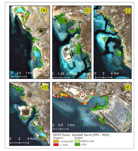 NDVI trends with p-values < 1 (which shows all trends) based on Kendall’s tau-b correlation (1991–2023) for the Asir mangroves. The subfigures represent trends for groups (a–e).