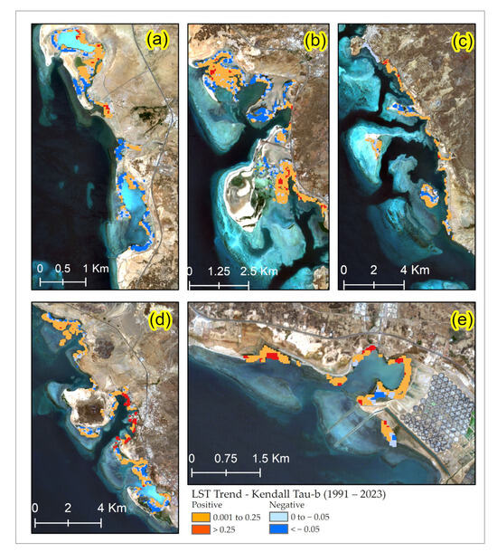 LST trends with p-values < 1 (which shows all trends) based on Kendall’s tau-b correlation (1991–2023) for the Asir mangroves. The subfigures represent trends for groups (a–e).