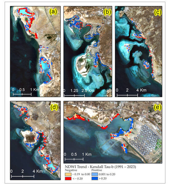 NDWI trends with p-values < 1 (which shows all trends) based on Kendall’s tau-b correlation (1991–2023) for the Asir mangroves. The subfigures represent trends for groups (a–e).