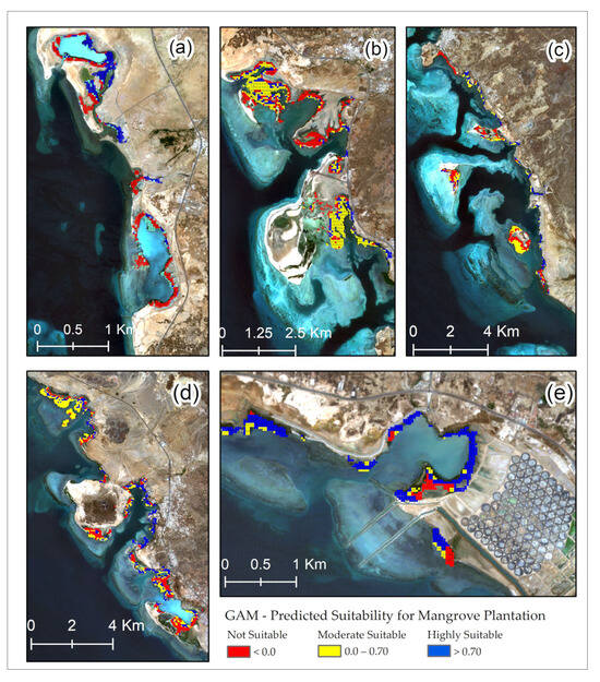 Predicted suitability for mangrove plantations along the Asir coast via a generalized additive model (GAM). The subfigures represent trends for groups (a–e).