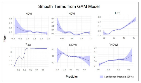 The model demonstrated a strong fit, with adjusted R-squared values of 0.89. The significance of the smooth terms revealed that all the terms were statistically significant. The smooth term for the NDVI had an edf of 7.25 and an F value of 1.83 (p = 0.018); the LST had an edf of 8.46 and an F value of 42.79 (p < 2 × 10−16); the NDWI had an edf of 8.90 and an F value of 6.89 (p < 2 × 10−16); the τNDVI had an edf of 7.4 and an F value of 10.393 (p < 2 × 10−16); the τLST had an edf of 8.99 and an F value of 24.74 (p < 2 × 10−16); and the τNDWI had an edf of 5.97 and an F value of 5.33 (p < 2 × 10−16). These results indicate significant relationships between the environmental indices and the suitability scores (Figure 10).