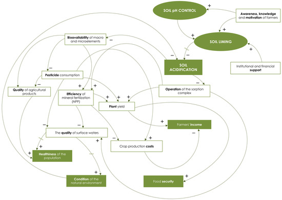 As part of the objective set in this paper, typical systems thinking tools were reviewed. As evidenced in the works of the precursor of systems thinking [40,41], these include causality loop diagrams, system archetypes, mathematical models, social studies, and computer simulations of systems. Undoubtedly, the operation of some archetypes could be found in the relationships between the natural, technological, economic, and social aspects of soil acidification. However, it was recognised that these elementary relationship structures could be subject of separate research. Moreover, mathematical models and computer simulations of the systems would require extremely labour-intensive mathematical operations on the existing knowledge about the systems and relationships between the natural, technological, economic, and social aspects of agricultural production. This knowledge would have to be transformed into mathematical equations, and if computer simulations were to be the outcome, we would additionally need to calibrate all the data streams and initial states of all the resources in the system. In this context, causal loop diagrams and social research were the most promising and complementary.