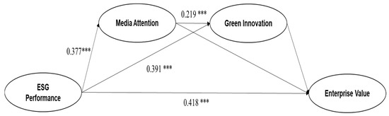 Similarly, green innovation serves as another mediating force in the ESG–firm value connection. As the core drive of transitioning toward a green economy, green innovation enables companies to harness environmental strategies for economic benefit. Strong ESG performance creates an enabling environment for green innovation, allowing companies to achieve breakthroughs in environmental protection while transforming these efforts into tangible economic gains [7,14]. Green innovation enhances enterprise value by fostering long-term growth and sustainability, thus playing a critical role in reinforcing the link between ESG performance and firm value [15]. Together, media attention and green innovation serve as mediators that amplify the positive impact of ESG on firm value, ensuring both environmental and economic success for businesses.
