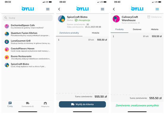 In this way, the DYLLI application modernizes business processes and becomes a driving force for changes in B2B relations, offering companies a tool that significantly increases the quality, speed, and efficiency of cooperation. Figure 1 shows screenshots from the latest version of the DYLLI mobile app. The following screenshots illustrate the key functionalities of the DYLLI application, showcasing its user-friendly interface and essential features designed to enhance communication and streamline operations within the HoReCa sector.