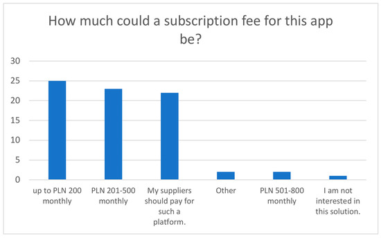 The first seven questions required the respondent to evaluate the proposed functionality/module by the DYLLI‘s team. The cafeteria has been prepared in the form of a five-point Likert scale: 1 star—unnecessary, 2 stars—medium importance, 3—I have no opinion, 4—high importance, and 5—extremely necessary. For an overview of each question, a photo (screenshot) from the application is attached. The modules that were asked for were as follows: chat with suppliers, storing order history, access to all local suppliers, creating orders from different suppliers in one shopping cart and with one payment, co-created shopping list, and the ability to fulfill recurring orders.