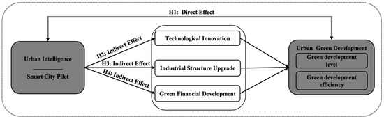 The essence of urban intelligence lies in transforming urban development models and innovating governance frameworks, with its impact on green development being multidimensional and complex [30]. At the macro level, urban intelligence enhances green development by optimizing resource allocation and environmental governance, leveraging technologies such as digital twins and smart city planning. By employing data-driven real-time monitoring and resource management, smart cities can efficiently allocate energy, minimize waste, and regulate pollution emissions, thereby fostering ecologically sustainable development on a global scale [62]. At the meso level, urban intelligence drives green development by optimizing various stages of the industrial chain [63]. Through enhanced information sharing and data integration, intelligent technologies improve the collaborative efficiency of industries, streamlining raw material procurement, production processes, logistics, and distribution [64]. These not only reduce resource consumption and carbon emissions but also promote the development of green product supply chains. For instance, intelligent systems facilitate energy optimization, lower pollutant emissions, and foster real-time adjustments in production processes. Additionally, the establishment of intelligent industrial clusters accelerates the adoption of clean technologies, increasing the overall efficiency of green industries and further expanding the low-carbon industrial ecosystem [65]. At the micro level, intelligent technologies empower enterprises across production stages, enhancing operational efficiency and supporting the transition to green production and circular economy models [66]. Moreover, the widespread application of personalized intelligent solutions—such as “Intelligence + Green”—heightens public environmental awareness and promotes adopting low-carbon lifestyles. In summary, urban intelligence creates a synergistic effect across the macro, meso, and micro levels, collectively advancing the realization of green development. Therefore, the following hypothesis is proposed: