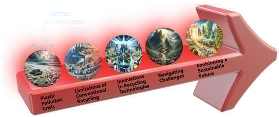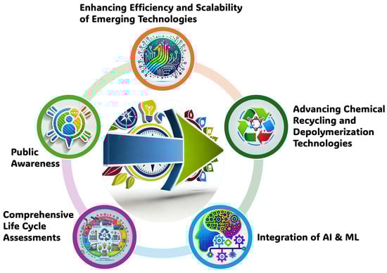 Innovations in plastic waste recycling technologies are pivotal in realizing the circular economy [46,47]. Advanced recycling methods, such as chemical recycling and biological processes, enable the conversion of plastic waste into valuable raw materials that can be reintroduced into the production cycle [48,49]. Chemical recycling, for instance, breaks down plastics into their original monomers or other useful chemicals, facilitating the production of new plastics without the quality loss associated with mechanical recycling [50,51]. Biological processes leverage enzymes and microbes to degrade plastics, offering opportunities for recycling materials that are difficult to process mechanically [52,53,54]. Despite their promise, the development and implementation of these innovative technologies face several challenges. Technical obstacles include the efficient processing of mixed and contaminated plastic waste streams [46], while economic challenges pertain to the scalability and cost-effectiveness of advanced recycling methods [55]. Regulatory hurdles involve the need for supportive policy frameworks and international agreements that facilitate the adoption of sustainable practices [42,45]. Public awareness and engagement in sustainable waste management practices are also crucial for the success of the circular economy [44].