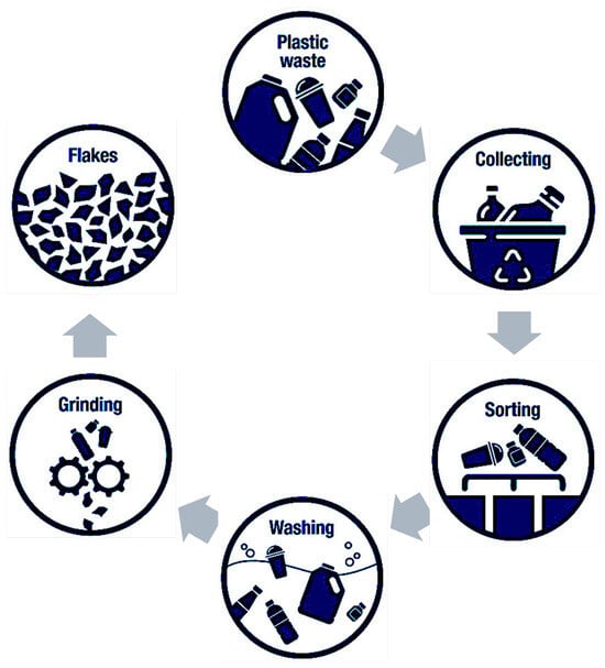 Physical and mechanical recycling are the most established and widely implemented methods for processing plastic waste. These methods recover plastic materials through mechanical means without significantly altering the chemical structure of the polymers. The fundamental steps involve collection, sorting, cleaning, size reduction, and reprocessing into new plastic products (see Figure 2) [56,57,58].