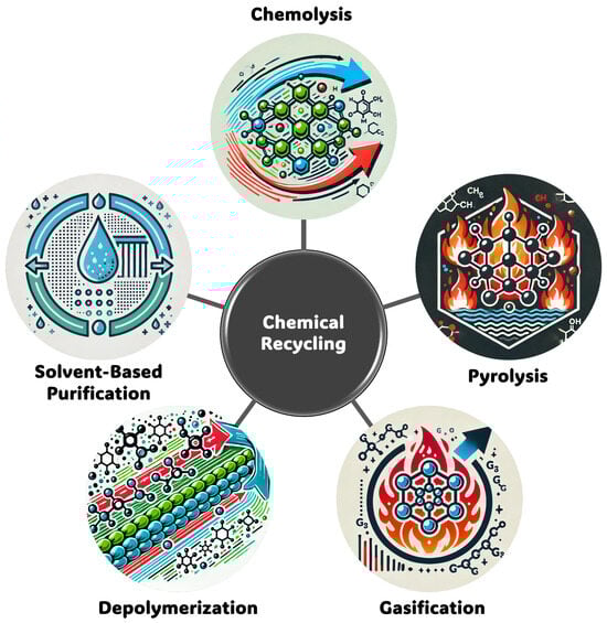 Chemical recycling stands at the forefront of innovative strategies aimed at addressing the escalating crisis of plastic waste. Unlike traditional recycling methods that mechanically reprocess plastics, often leading to a degradation of material quality, chemical recycling delves into the molecular level. It transforms waste plastics back into their original monomers or other valuable chemicals, thereby offering a pathway to produce virgin-quality materials from recycled content [73]. This section explores the foundational concepts of chemical recycling, its primary methods (Figure 3)—chemolysis, pyrolysis, gasification, chemical depolymerization, and solvent-based purification—and highlights recent advancements and their consequential benefits [46].