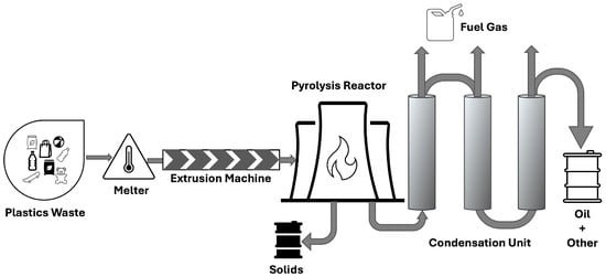 Pyrolysis, a method of thermal decomposition of plastic in an oxygen-free environment, converts waste plastics like polyethylene (PE), polypropylene (PP), and polystyrene (PS) into a mix of oil, gas, and char, offering a viable path for recycling [79,80,81]; see Figure 4.