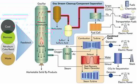 - Hydrogen Production: The hydrogen-rich syngas can undergo steam reforming or water–gas shift reactions to increase hydrogen yield, producing high-purity hydrogen gas suitable for fuel cells and industrial applications [159,160,161,162].