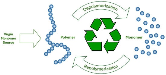 Chemical depolymerization distinguishes itself from thermal processes like pyrolysis and gasification by specifically targeting and breaking down the chemical bonds within polymers, converting them back into monomers or predefined chemicals without significantly altering their molecular structure. This method is adept at recycling plastics such as PE terephthalate (PET) and polylactic acid (PLA), transforming them into high-quality raw materials that can be repolymerized into new plastic products, thereby embodying the principles of the circular economy [50,51]; see Figure 6. Chemical depolymerization represents a crucial advancement in our pursuit of sustainability in polymer science. By converting waste plastics back into valuable monomers or other chemicals, this process not only addresses the environmental challenges posed by plastic waste but also aligns with the circular economy’s goals, fostering a more sustainable and efficient approach to resource management.