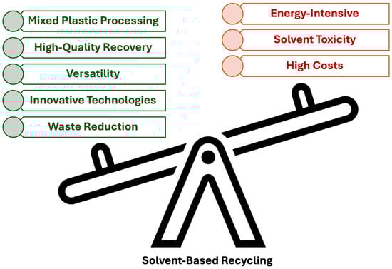 Overview of solvent-based recycling methods, highlighting their advantages such as mixed plastics processing, high-quality recovery, versatility, innovative technologies, and waste reduction and their disadvantages, including energy-intensive processes, solvent toxicity, and high costs.