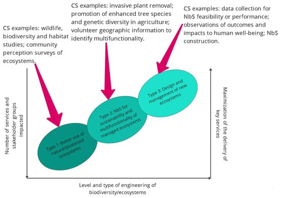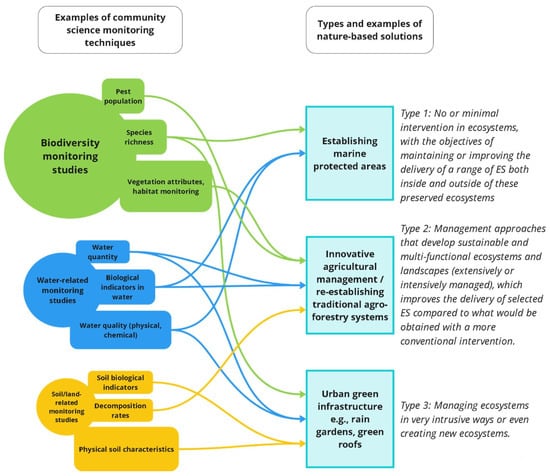 For example, in the case of a Type 3 NbS, green infrastructure or artificial ecosystem development (e.g., living docks, oyster gardens, and artificial shorelines), CS that can support effective application of the NbS will benefit from measuring species richness of a water ecosystem (biodiversity monitoring) and measuring aquatic biological indicators through invertebrate sampling, benthic algal growth, and benthic oxygen demand (water-related monitoring). The localized nature of implementing increasingly engineered solutions alongside maximizing delivery of key services may explain why more CS monitoring functions support Type 3 NbS. Specialized monitoring and CS projects particularly targeting urban areas, which are often features of Type 3 NbS, promote early detection and rapid response processes to new species invasions in populated areas [67].