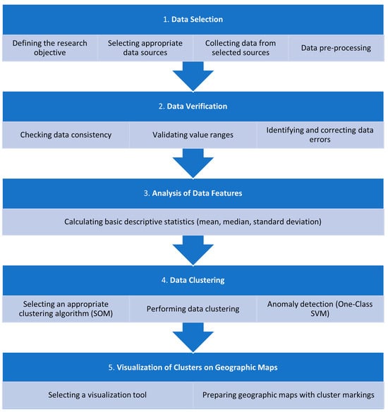 The study of complex phenomena, which include the use of RES and the degree of environmental degradation in EU countries using multivariate analysis methods, requires a multi-stage study. The next steps of such a study are presented in Figure 1.