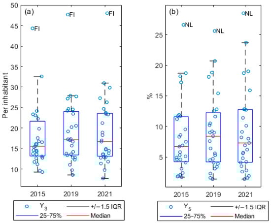 The only indicator with negative asymmetry, in each year studied, was Y7—average CO2 emissions per km from new passenger cars. An interesting situation was observed in relation to its value. In 2019, its value increased significantly compared to 2015, followed by a decrease in average CO2 emissions per km from new passenger cars in 2021, to pre-COVID-19 pandemic levels in 2015. The situation indicates that the number of new cars has been increasing since 2015. This trend occurred until 2019, and during the COVID-19 pandemic, the number of new cars purchased decreased. Although new passenger cars are increasingly efficient in terms of CO2 emissions per kilometer, they still contribute to environmental degradation. The highest CO2 emissions per km from new passenger cars in 2021 were observed in the Baltic countries: Lithuania, Latvia, and Estonia. The lowest were in The Netherlands, Portugal, and Denmark. A key way to reduce the impact of CO2 emissions from cars, including new vehicles, is to promote sustainable transport, including the development of electric cars powered by renewable energy, the expansion of public transport infrastructure, as well as the change in consumer habits, such as the use of car-sharing or bicycles.