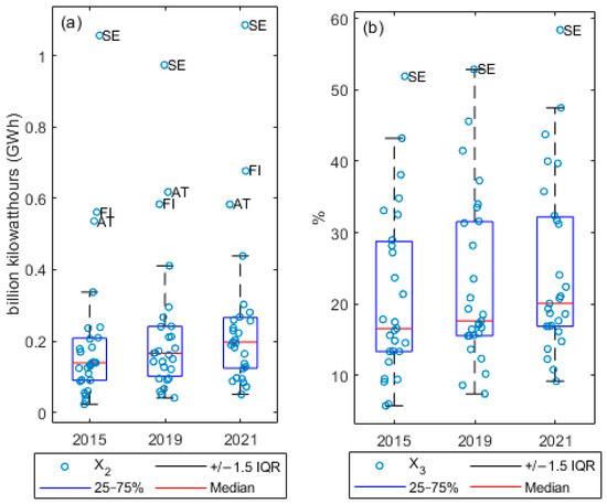 The indicators adopted to assess the use of RES were characterized by strong or very strong right-sided asymmetry. The strongest asymmetry occurred in relation to the X10 and X2 indices. The occurrence of such a strong asymmetry is associated with very high values of these indicators for countries such as Sweden, France, and Italy. In these countries, a large amount of hydropower is produced, which is due to the fact that they have water resources used for its production. The weakest asymmetry was characterized by the distribution of the X4 index—share of renewables in electricity production. A particularly low degree of asymmetry of variable distributions was noted for 2021. The indicators were also characterized by strong or very strong volatility. The strongest volatility referred to the indicator X10—hydroelectricity generation per 100,000 inhabitants. The highest values of the indicator were observed for Sweden, Austria, and Finland. The lowest volatility was noted for the X3 indicator—share of clean energy. A positive trend was the decreasing differentiation for X3, which indicated a narrowing of the differences between countries in terms of the share of clean energy. In each of the surveyed years, the highest shares of clean energy were observed in Sweden (51.91–58.40%), Finland (43.23–47.49%), and Latvia (about 41%). The lowest shares of clean energy levels were recorded for Malta (6.00–9.18%) and The Netherlands (5.75–10.79%). Another positive phenomenon was the increase in the level of the share of clean energy in most EU countries. The largest increase was observed in the case of Estonia and Luxembourg, by just over 11 percentage points. Only with regard to Hungary and Croatia did the share of clean energy in 2021 decrease by less than 1 percentage point compared to 2015. The increase in the share of clean energy in the EU countries was reflected in the average value for this indicator, which increased by 3.8 p.p. in 2021 compared to 2015 and amounted to 24.3%. Analyzing the values of other indicators that had a stimulating effect on the volume and consumption of RES in the EU countries, it can be concluded that there was an increase in the average values of individual indicators. A significant increase was recorded for the following indicators: X2, X3, X4, X6, X7, and X8. A slightly smaller one was recorded for the others, among which there were indicators relating to energy from wind, water, and solar. Figure 3 illustrates selected indicators describing the use of RES in 2015, 2019, and 2021.