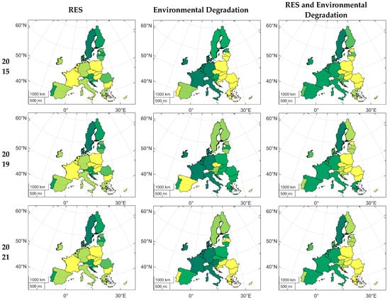 To achieve our research objectives, we refer to information contained in the Eurostat Database and TheGlobalEconomy.com, indicating the use of renewable energy and the degree of environmental degradation in the EU countries in 2015, 2019, and 2021.