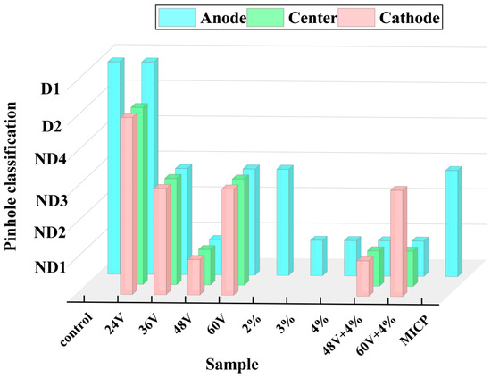 The dispersivity of the soil was analyzed using pinhole tests, crumb tests, double hydrometer tests, and exchangeable sodium percentage (ESP) tests. The treated soil exhibited significantly lower dispersivity compared with the original soil. The most pronounced enhancement effects were observed under four specific conditions: 3%, 4%, 48V (EK), and 48V + 4%, as illustrated in Figure 3.
