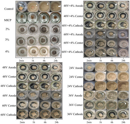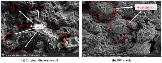 The results of the crumb tests are presented in Figure 5. In a beaker containing untreated dispersed soil blocks, it was observed that the soil blocks rapidly hydrolyzed, and the water became cloudy and misty. After one hour, the soil blocks had completely disintegrated, and the bottom of the container was covered with a layer of suspended matter, indicating high dispersibility in the untreated soil sample. The untreated soil was classified as dispersive because of its high dispersivity. After treatment with EK (48V), additives (4%), and a combination of EK and chemical additives (48V + 4%), the soil blocks showed only slight turbidity upon hydrolysis, with no visible diffusion in the turbid state. These treated soil samples were classified as non-dispersive. The dispersivity of the soil treated with a combination of EK and additives was lower than that of the soil treated with MICP, EK, or additives alone. For dispersive soil, the presence of substantial fine particles, small pores, and low permeability hinders the movement of microorganisms and water, limiting the supply of essential nutrients necessary for microbial growth and reproduction [24]. Consequently, the inadequate microbial mineralization reaction restricts the formation of induced calcium carbonate crystals, which may not sufficiently fill the pores. As a result, the calcium carbonate only cements a fraction of the soil particles, leading to suboptimal soil mineralization [25]. This, in turn, means that the soil dispersivity does not decrease to a minimum.